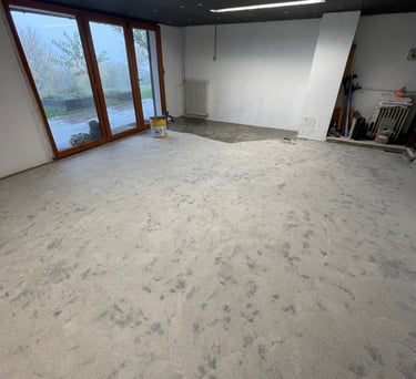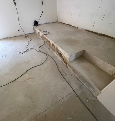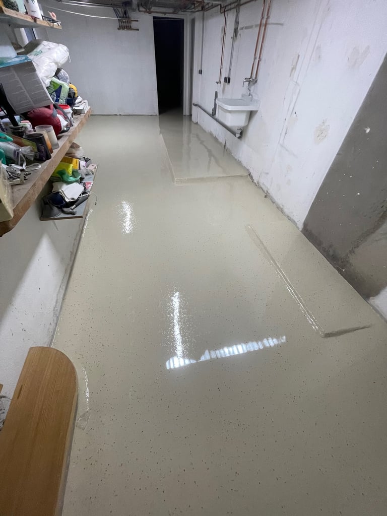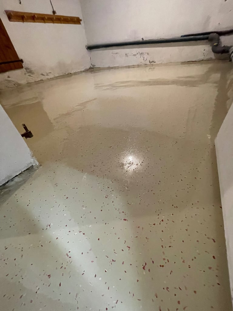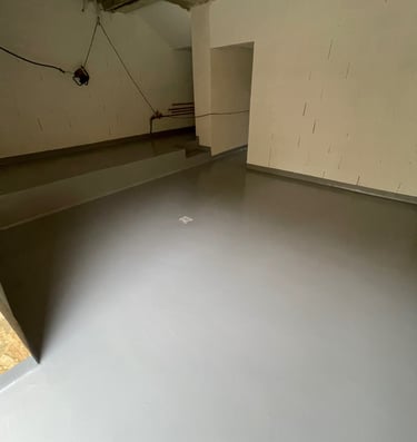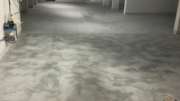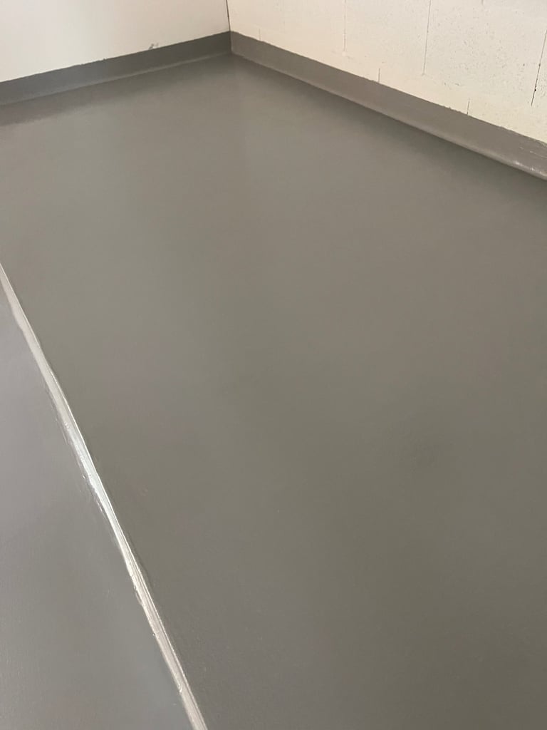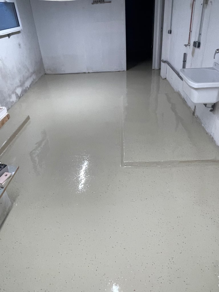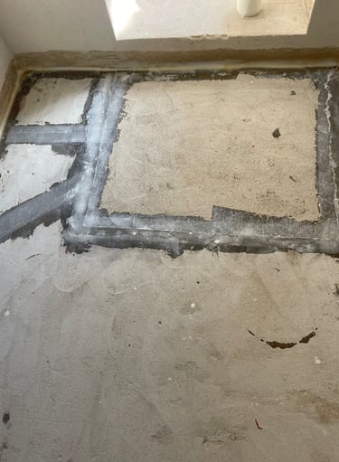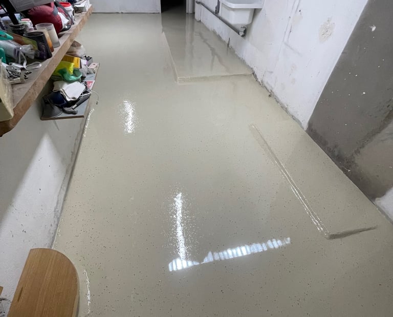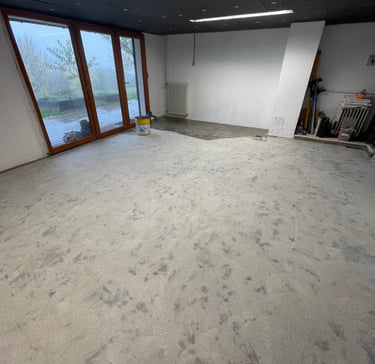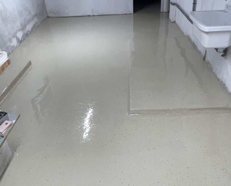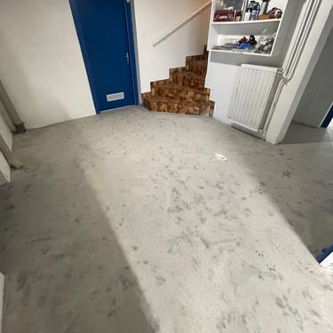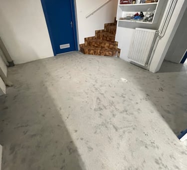 Rénovation d'un sol dans la commune de Romans, dans le 01, incluant un espace de stockage et un hammam. Après la préparation du sol, des fissures ont été constatées, nécessitant un traitement par une bande armée. Intégration de plinthes en mortier résine.