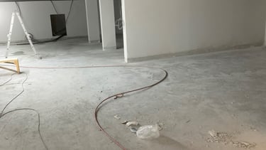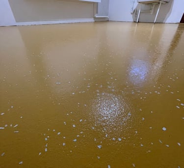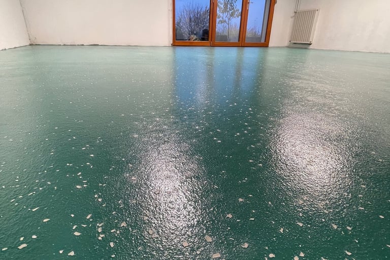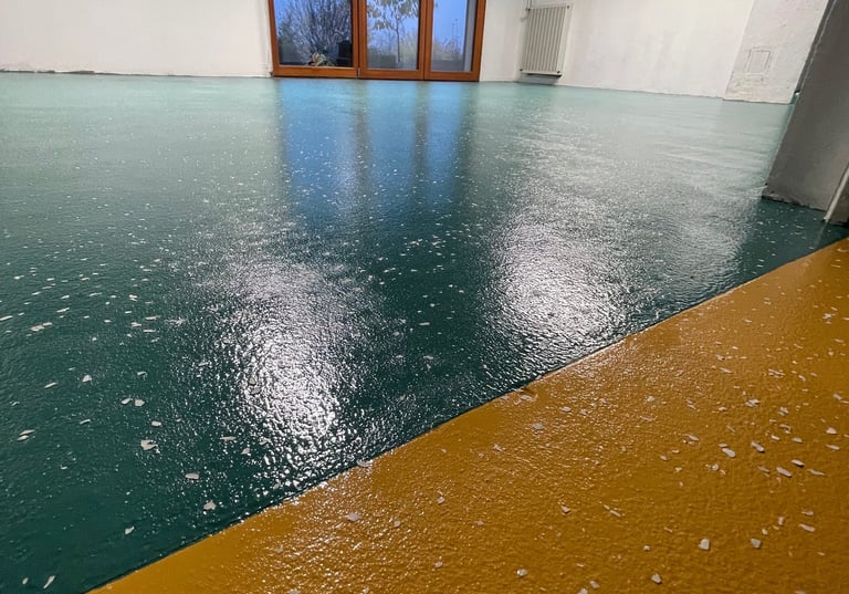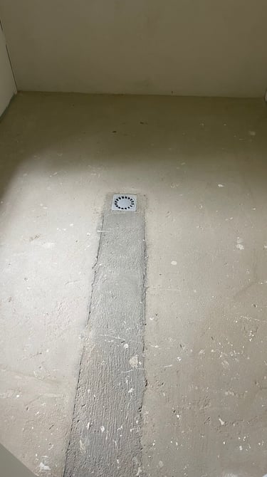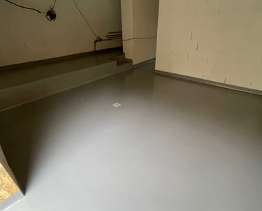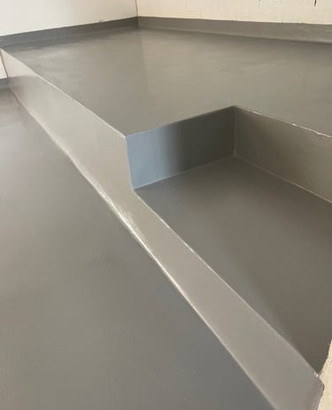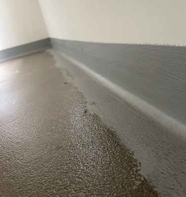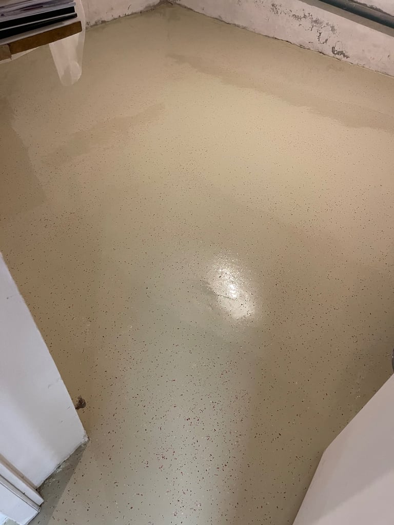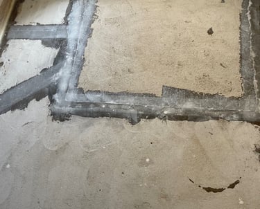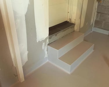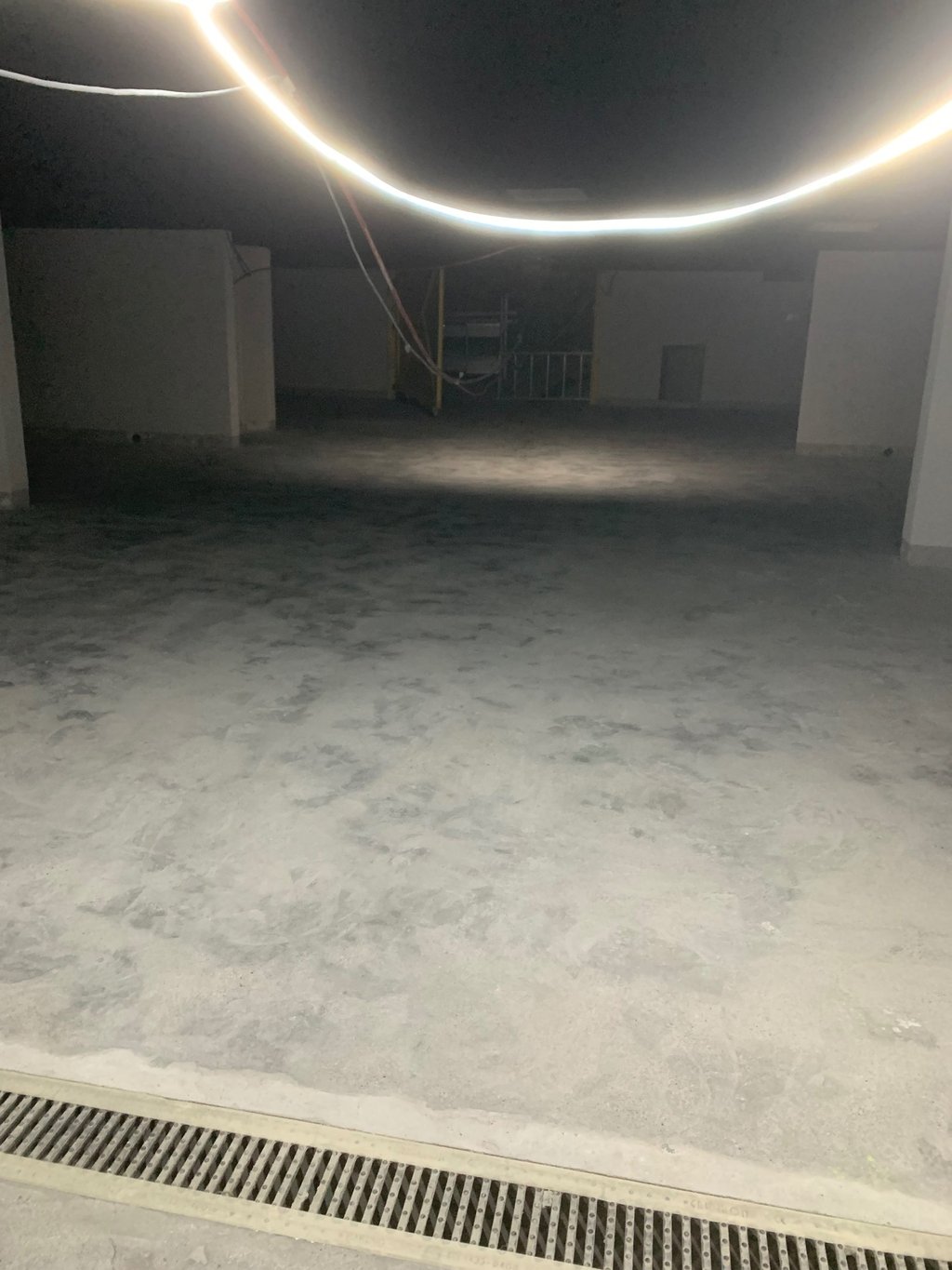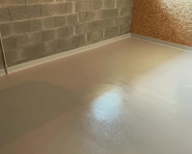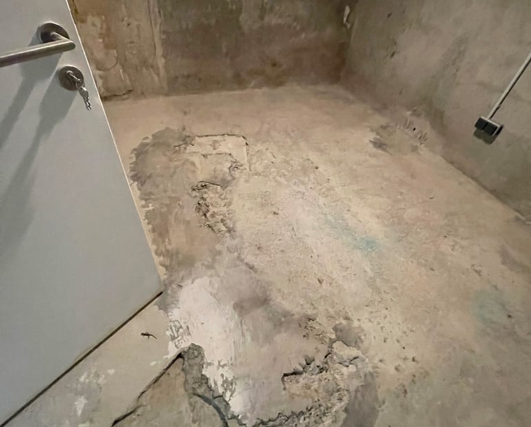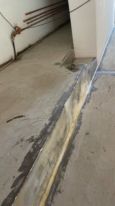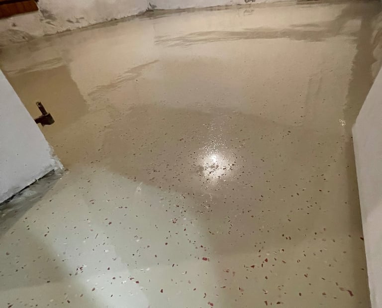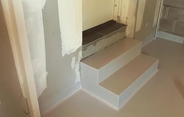 Rénovation d'un sol dans la commune de Romans, dans le 01, incluant un espace de stockage et un hammam. Après la préparation du sol, des fissures ont été constatées, nécessitant un traitement par une bande armée. Intégration de plinthes en mortier résine.
