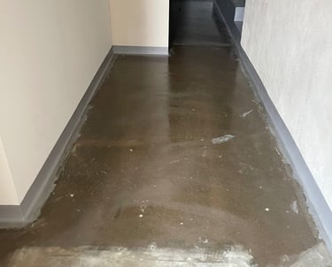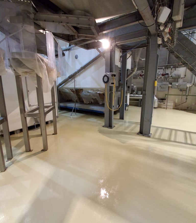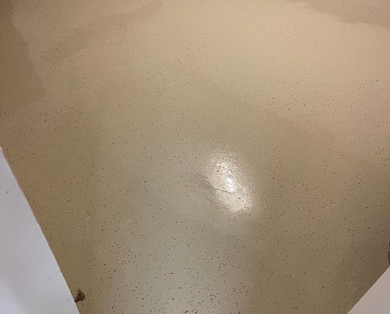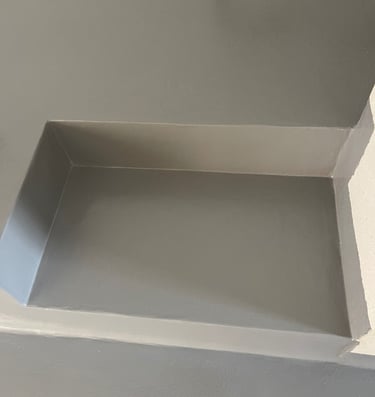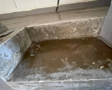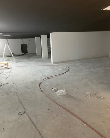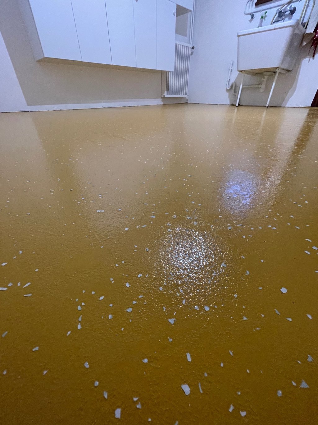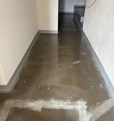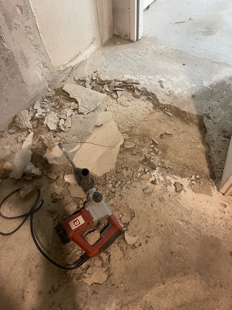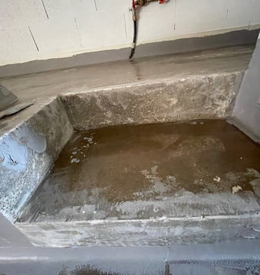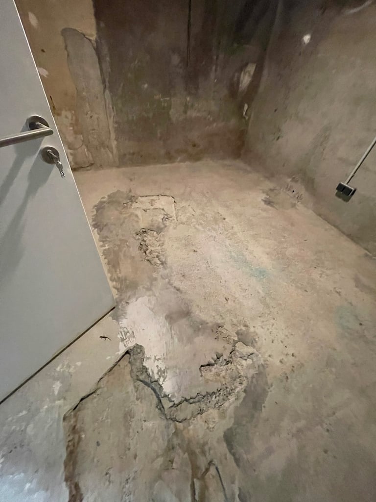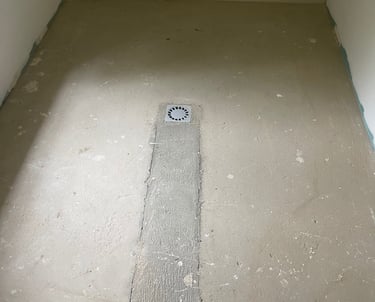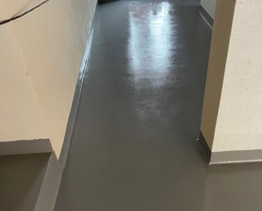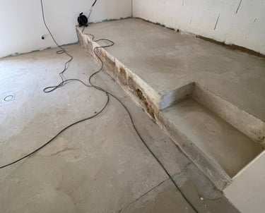 Rénovation d'un sol dans la commune de Romans, dans le 01, incluant un espace de stockage et un hammam. Après la préparation du sol, des fissures ont été constatées, nécessitant un traitement par une bande armée. Intégration de plinthes en mortier résine.