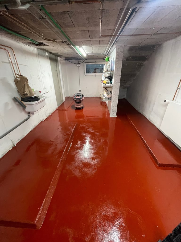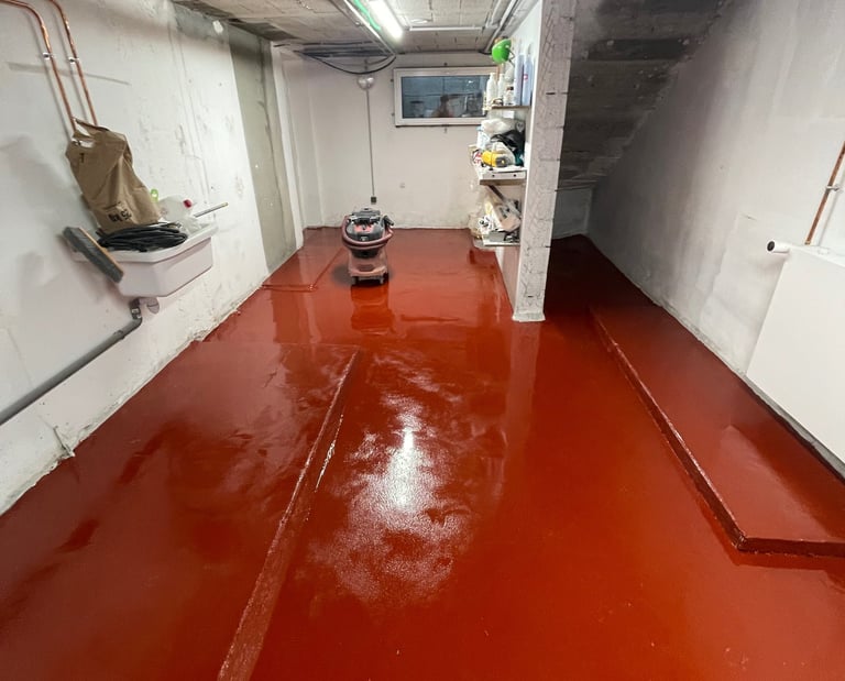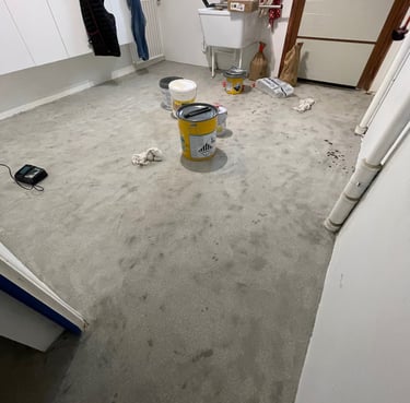 Rénovation d'un sous-sol sur la commune de Doussard , qui inclut une grande buanderie et deux espaces de stockage. Après préparation, le sol souffrait de sérieux défauts de solidité. Suite à un traitement avec un mortier résine, il a été possible de poursuivre l'application des couches suivantes sans interruption