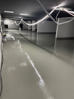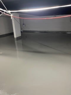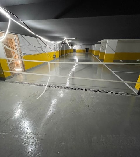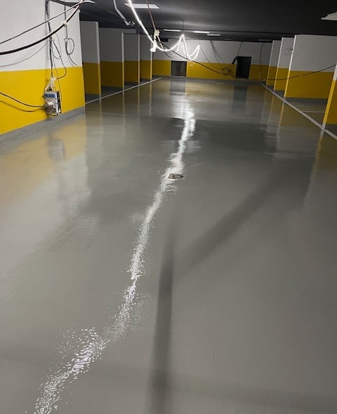 Rénovation d'un garage sur la commune de Seynod. Finition sablé antidérapant et pour une résistance supplémentaire avec incorporation de plinthe en mortier résine